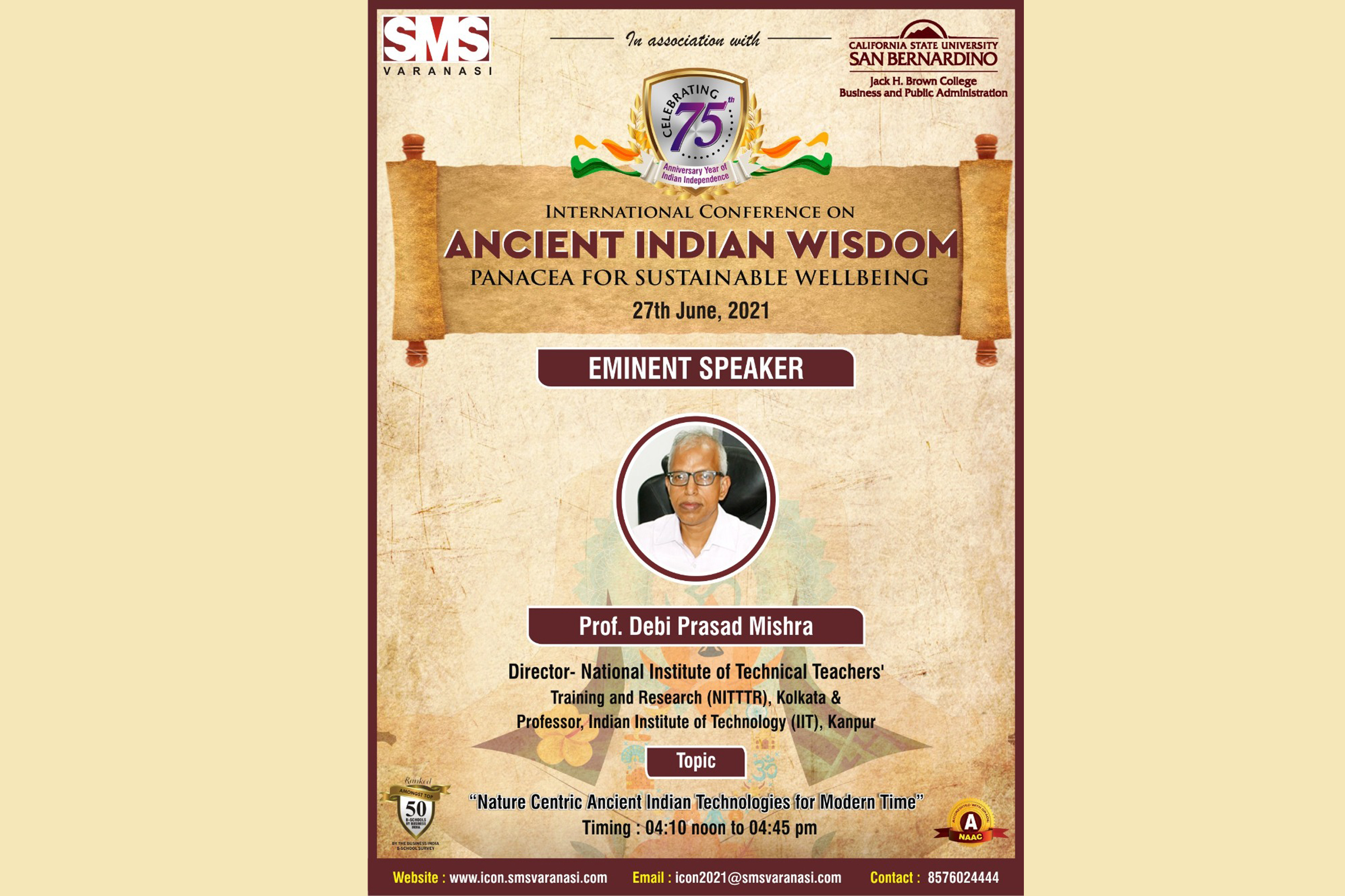 - Prof. Debi Prasad Mishra, Director, NITTTR, Kolkata will deliver a lecture in the International Conference on Nature Centric Ancient India Technologies for Modern Time on 27/06/2021 at 04:10 PM