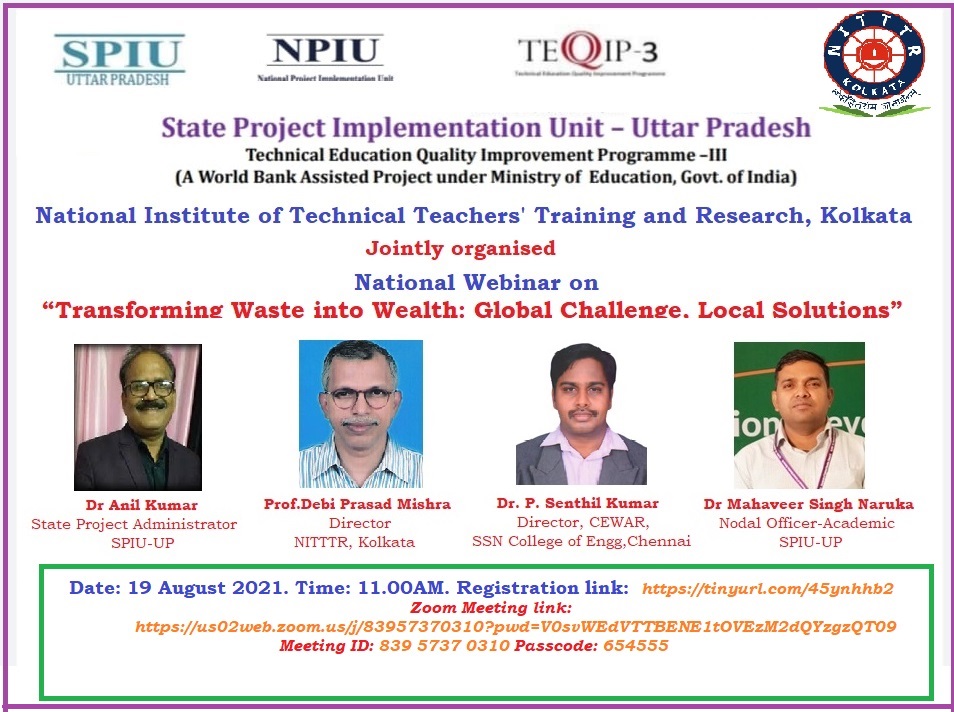 - National Webinar on Transforming Waste into Wealth: Global Challenge, Local Solutions on 19th August 2021 at 11:00 AM